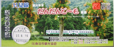 どうやら,コシヒカリの街魚沼をPRする活動のようで,2010年4月29日から2010年12月31日まで,430D列車(小出13:17~只見14:36)とこの427D列車(只見16:24~小出17:42)に乗った人全員に乗車証とパンフレットを配り,魚沼をPRしているそうです.